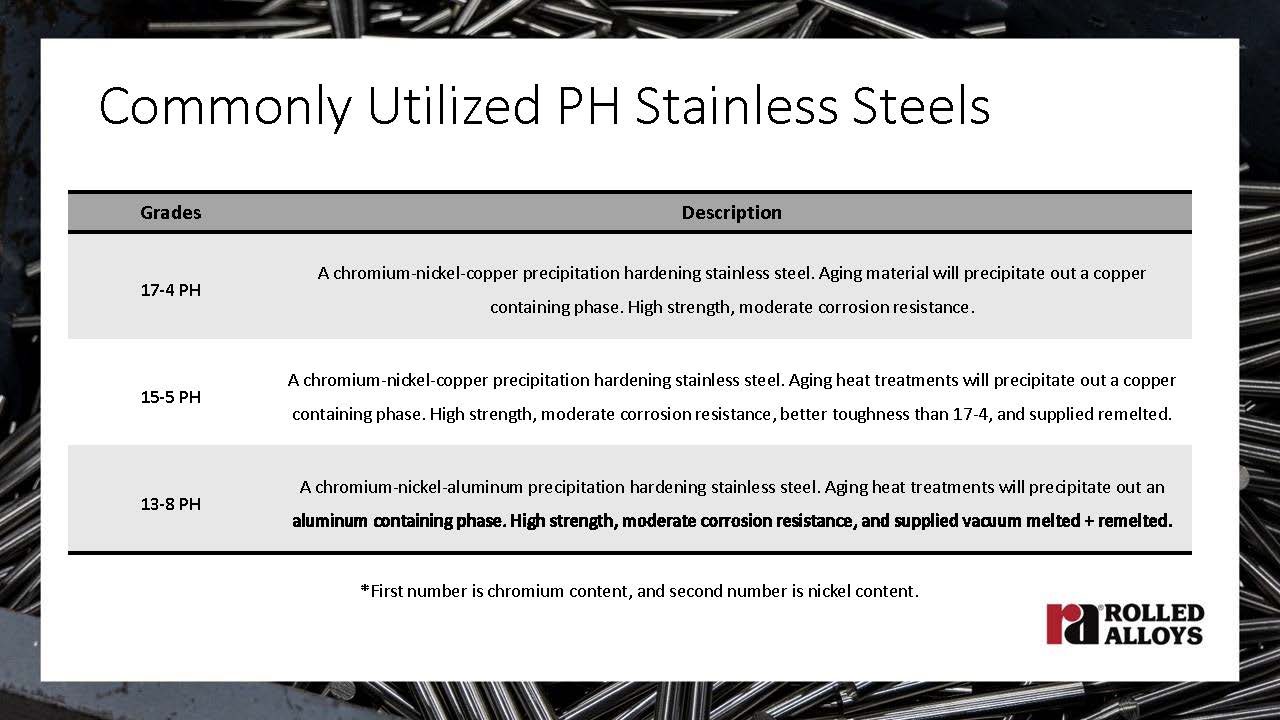 - Precipitation-Hardened (PH) Stainless Steels: PH stainless steels like 17-4, 15-5, and 13-8 offer the advantage of being hardenable through heat treatment, enhancing their mechanical properties. These materials are essential in applications requiring high strength but moderate corrosion resistance, such as fasteners, bearings, and high-wear surfaces. The aging process in these steels allows for precise control over mechanical properties, making them versatile in demanding aerospace applications.
