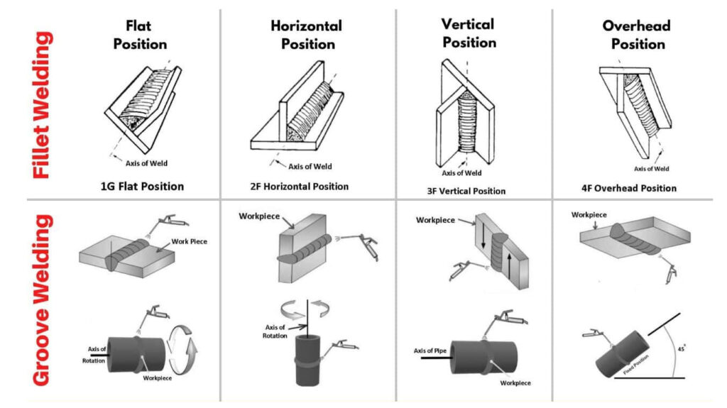 - Welding Position: Certain processes and consumables are limited by welding position. Planning based on vertical, overhead, flat, or horizontal welding positions is essential. The four primary welding positions are shown below, increasing difficulty from left to right.